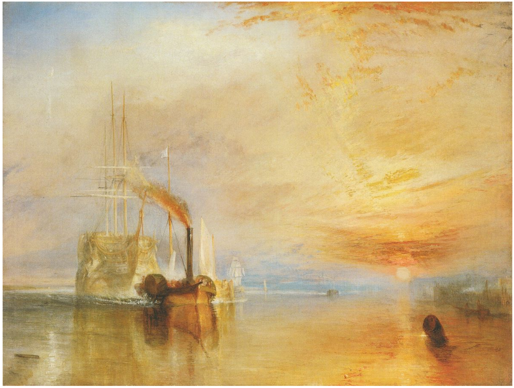 Auf dem Bild ist ein altes Segelschiff zu sehen, die Temeraire (franz. téméraire: furchtlos, kühn). Viel Jahre zuvor hatte sie einen wesentlichen Beitrag zum Sieg der englischen Flotte in der Schlacht von Trafalgar geleistet. Von Dampfschiffen gezogen wird sie zu ihrem letzten Liegeplatz gebracht, wo sie abgewrackt werden wird. Die Sonne geht gerade unter. Der Betrachter, der in seinem Kopfe die Segel der Temeraire noch einmal hisst, kann erahnen, dass...